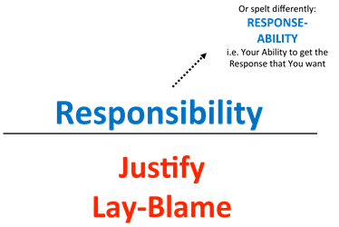 Look at the diagram Responsibility, Justify and Lay-Blame. If you are below the line, you are at effect and above the line, you are taking responsibility and are at cause. I often ask my clients ‘are you above or below the line at the moment?’ If they say below, I ask them what they would need to do or say to jump above the line.
