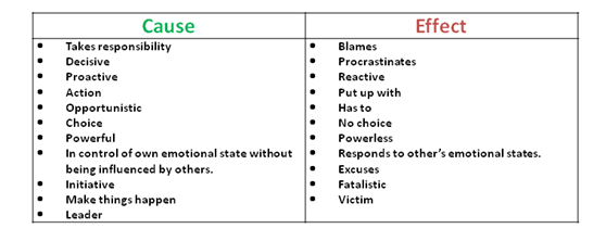 For example, you are late for a meeting and you blame the fact that the bus ran late. This is being at effect. In reality, you did not take into consideration that public transport is often unreliable and that you did not allow for this. Instead, if you were late for a meeting, a more at cause way of stating why you were late could be ‘I apologise for being late, my bus came late and I didn’t allow for this when planning for this meeting’. Can you see that you are taking responsibility here?